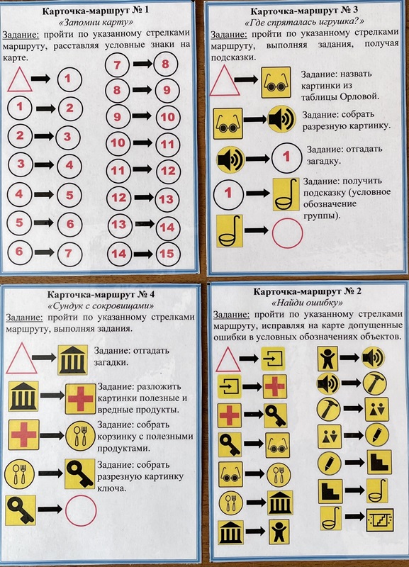 Участники получают карту с составленными на ней условными обозначениями и заранее заданным маршрутом, который указан стрелками. Педагог предлагает детям пройти по маршруту, находить контрольные точки и выполнять задания.