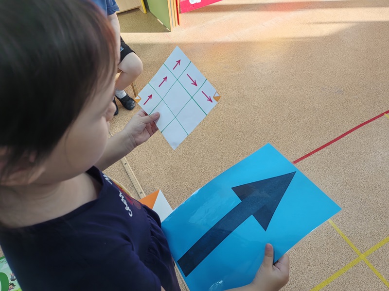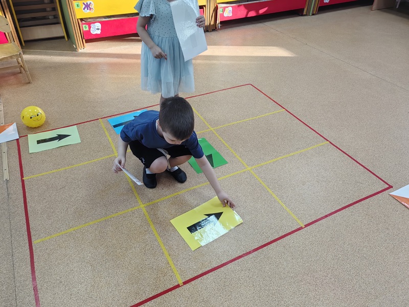 Выполнение задания: Дети по очереди или группами двигаются по игровому полю, следуя указаниям. Например, если на образце — схеме изображена стрелка вправо, ребёнок должен шагнуть в этом направлении. Если он ошибается, педагог может подавать сигнал (звуковой или визуальный), подсказывая, что нужно изменить направление.