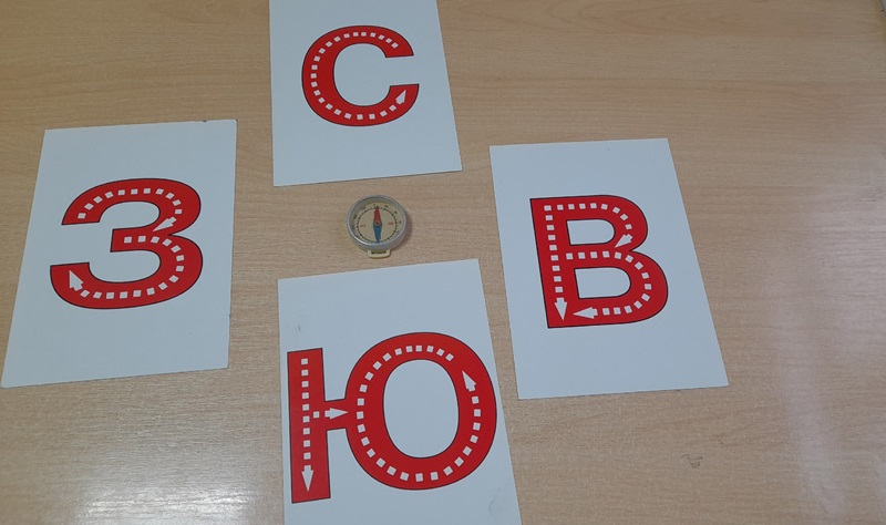 С детьми была проведена игра с использованием компаса «Определи по компасу какая игрушка где находится». В игре использовали такие слова, как : на севере, на юге, на западе, на востоке, ориентирование, части света.
