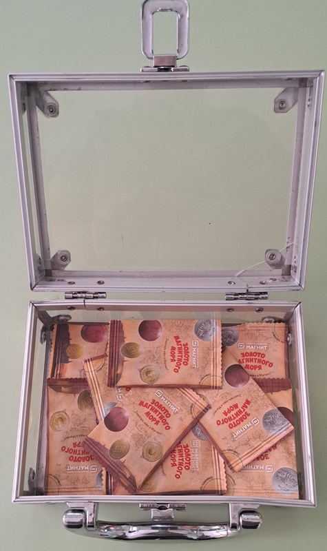 Под столиком со спортивным полем лежит фрагмент фото сундука с кладом.