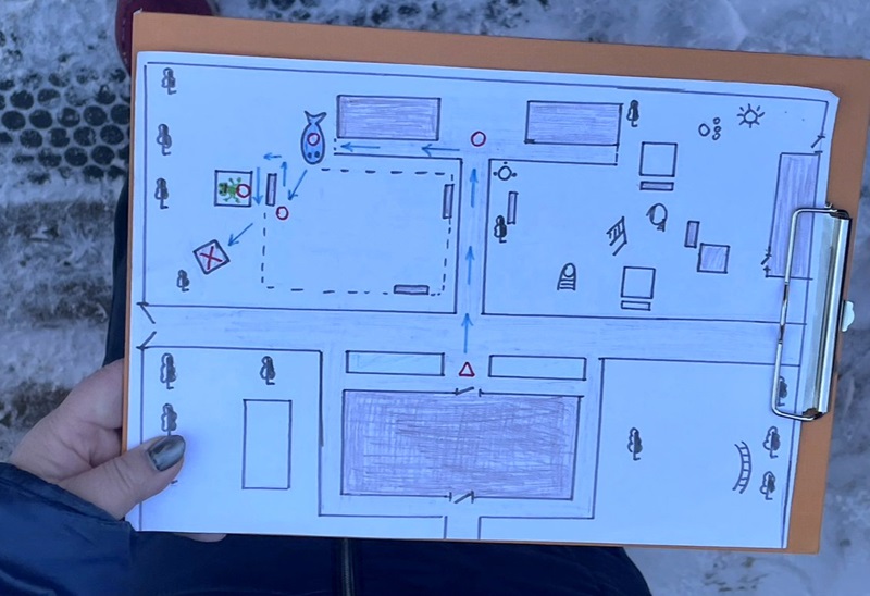 - листы бумаги с нарисованными маршрутами/схемами;