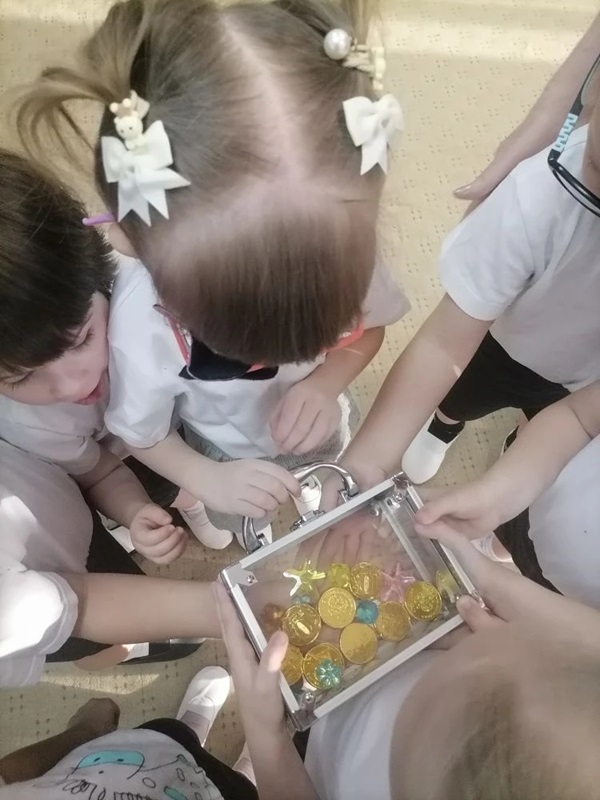 После того, как клад был найден все дружно убрали выносной материал и отправились в помещение детского сада. Заряд позитивных эмоций был получен!