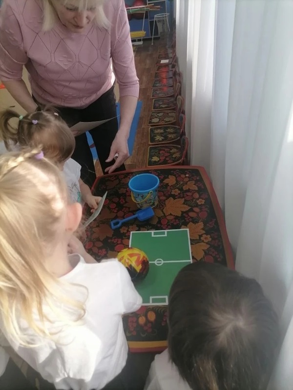 - Спортивное поле из картона, резиновый мяч, совок и детское ведерко
