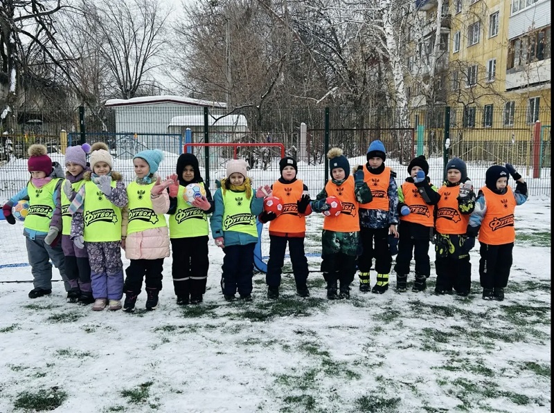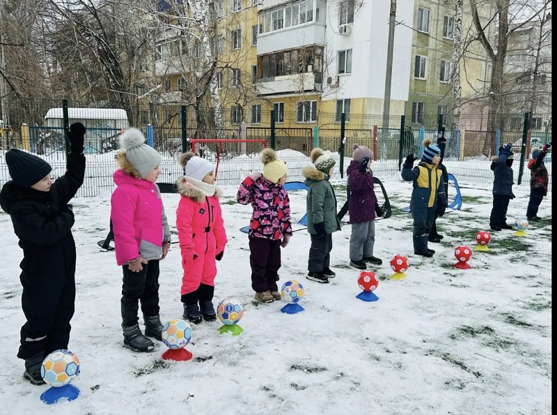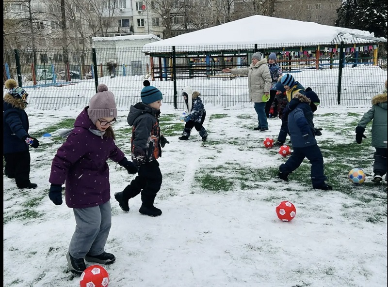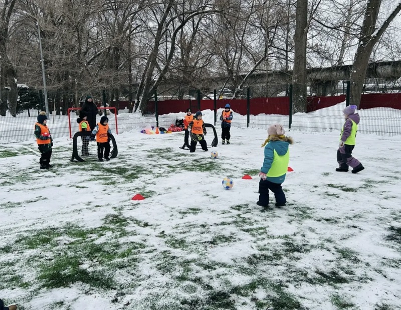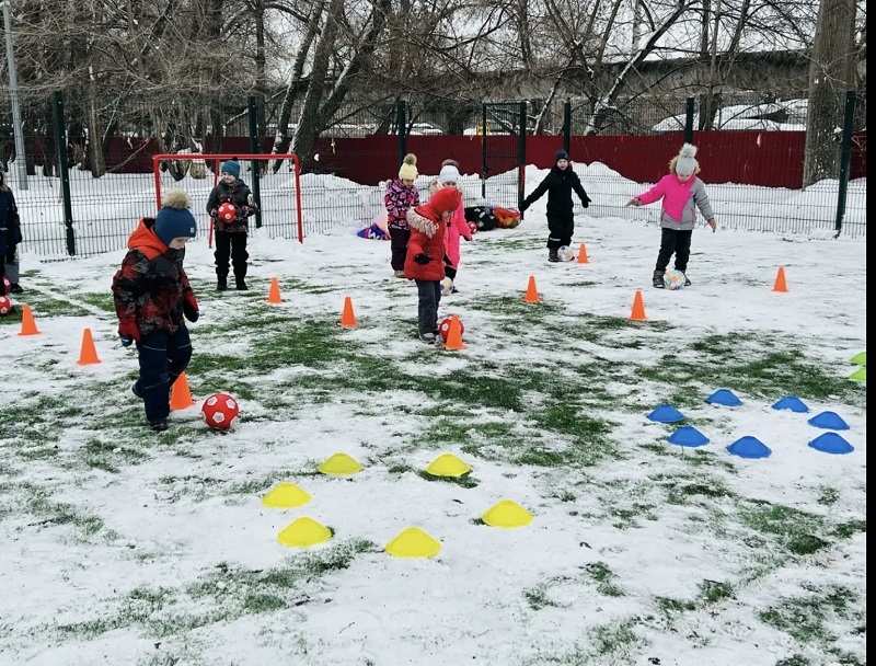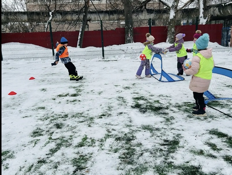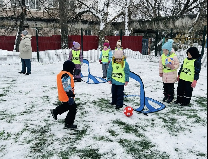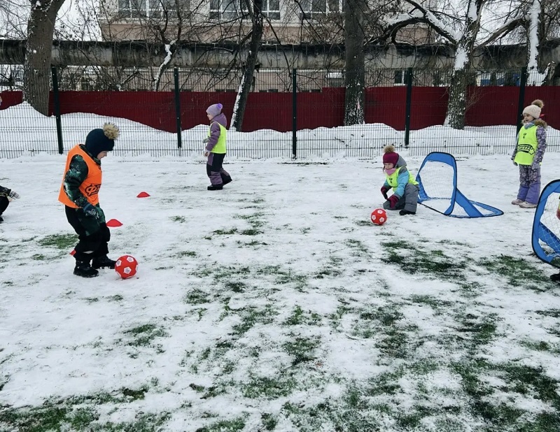 «Снежный футбол» - ведение и удары по воротам ярким мячом. Игра на внимание «Мяч - стоп!», «Дорожка приключений» - ведение мяча ногой, подвижная игра «Медведь и пчелы»